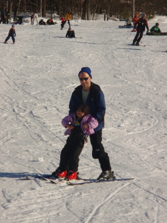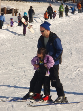 Since Aurora was having so much difficulty skiing on her own, Jon helped her down the bunny slope. She loved