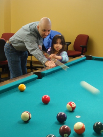 March 15, 2013: We took a tour of the Leisure World Club House. Jon taught Aurora how to play pool.