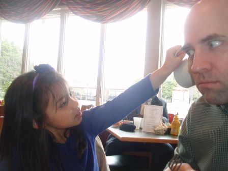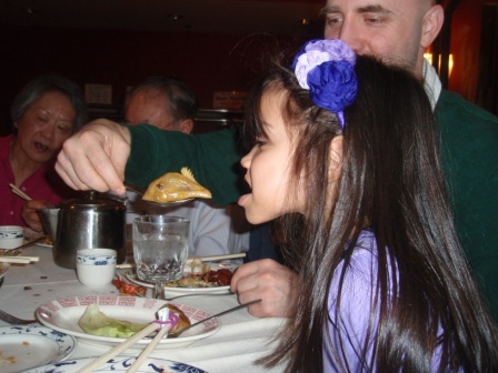 At dinner, Aurora was fascinated with the chicken head that showed up with one of the dishes.