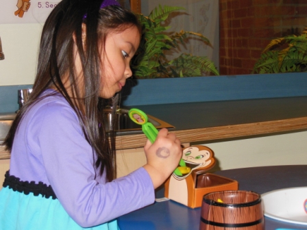 She had no trouble using these baby chopsticks to feed bananas to the monkey!