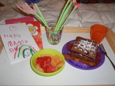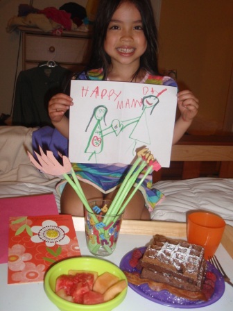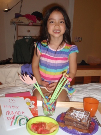 May 12, 2013: Happy Mother's Day! Aurora and Jon "surprise" Kathy with homemade chocolate waffles and fruit. Aurora