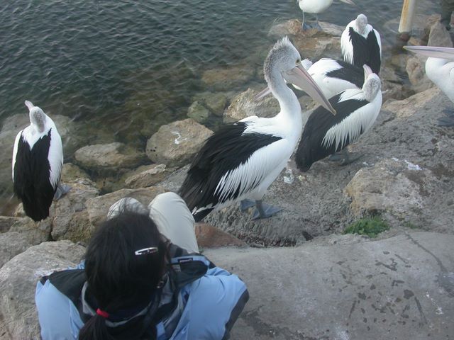 Australia, Part 1 -- Kathy, about to regret taking a front row seat next to the pelicans. When this dude spread his wings, they got a little too close for comfort!