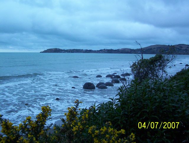 New Zealand -- More boulders. The village of Moeraki is in the background.