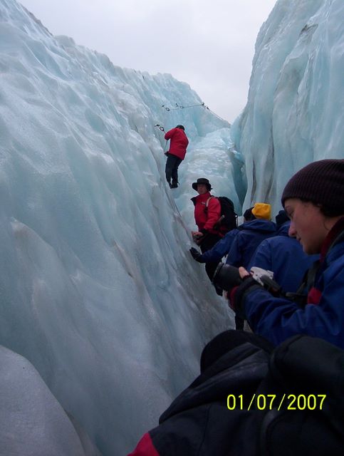New Zealand -- Another steep and narrow passage. The guy in red up top is making sure the ropes are still firmly attached to the ice.