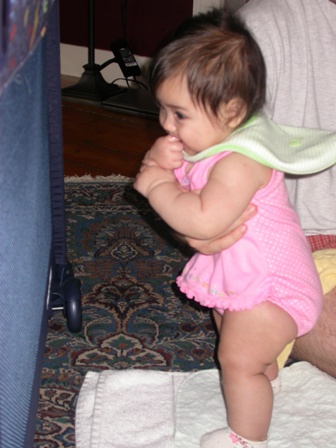 August 3: The girls are watching The Weather Channel in the morning...and then Aurora is trying to switch to something more interesting.