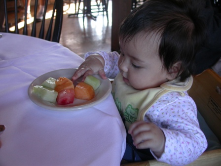 August 10: Aurora really enjoys "eating" fruit salad! She worked really hard to learn how to pick up
