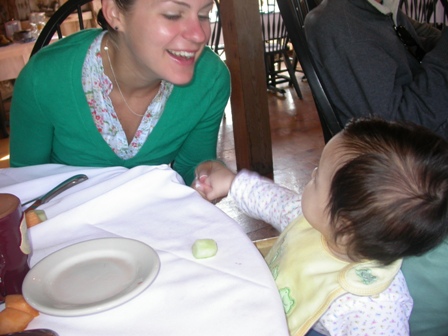 At dinner, Aunt Futing and Elena help take care of Aurora while her parents eat.