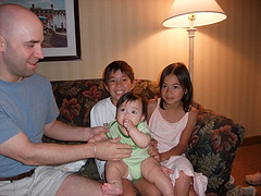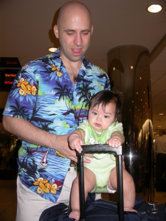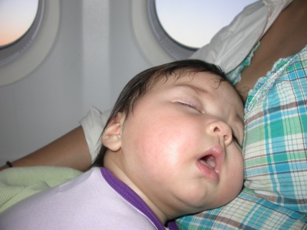 After a mini-meltdown on the plane (we sat on the runway for 2 hours), Aurora finally passes out. Jon, Kathy, and everyone else