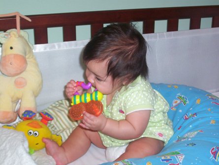 in every position anywhere in her crib. Unfortunately, she still has trouble distinguishing between things that are