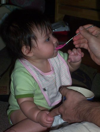 August 17: Trying rice cereal again...this time, more gets into Aurora's mouth than on her bib!