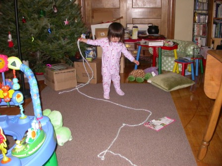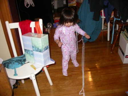 Aurora discovers the joy of playing with a long garland of plastic beads.