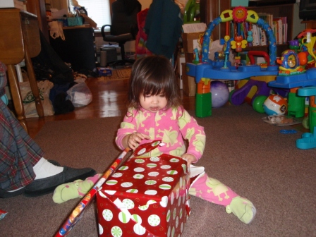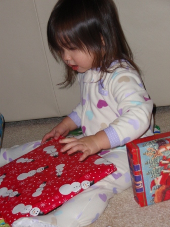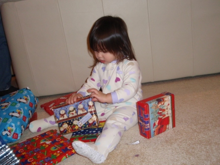 She first starts to make a pile of her presents, then sets to ripping open the packages!