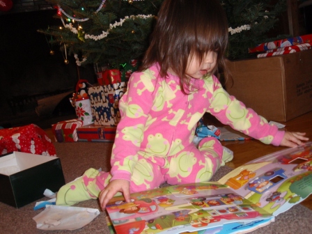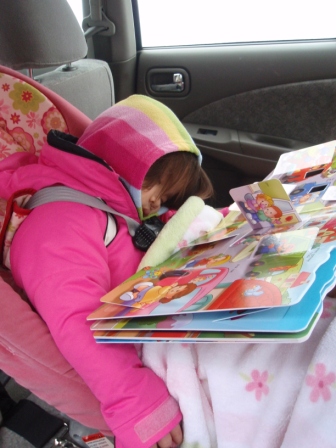 Here she is enjoying a new book. Aurora loves books, and has memorized several favorites.