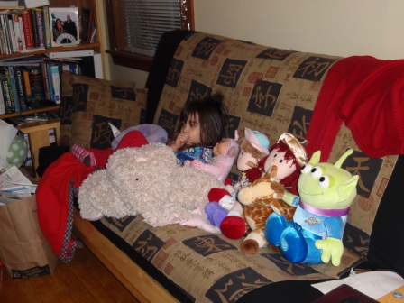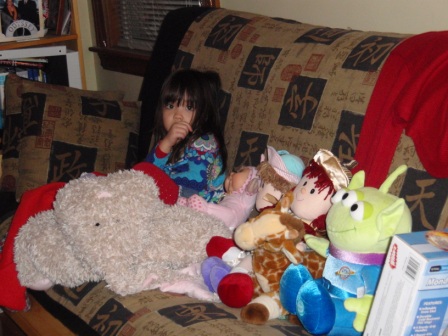 February 19, 2011: Aurora and her friends are all ready to watch Baba work out in the living room.