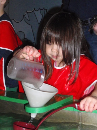 Peep's World, with water and sand tables, is full of things to do. Aurora always insists on putting
