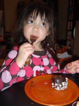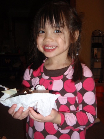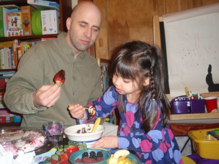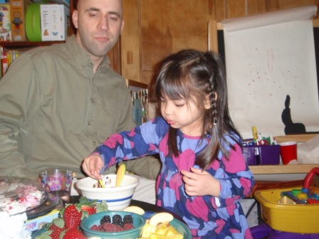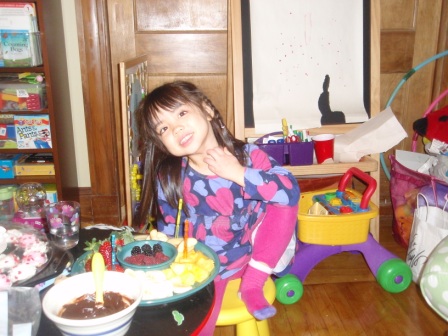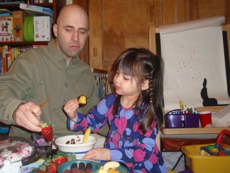 there's a special treat for dinner...chocolate fondue with lots of fruit! Aurora really