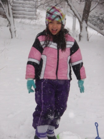 Aurora had already dressed herself, and put on her snowsuit, boots, and hat. Kathy discovered Aurora happily shoveling