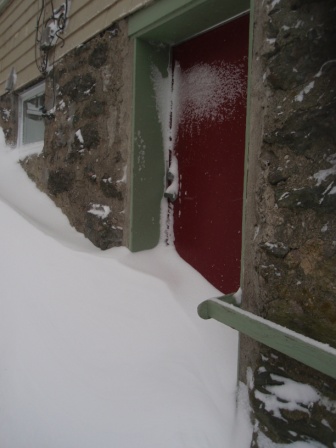 The neighbor's basement door is half covered in snow.