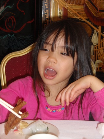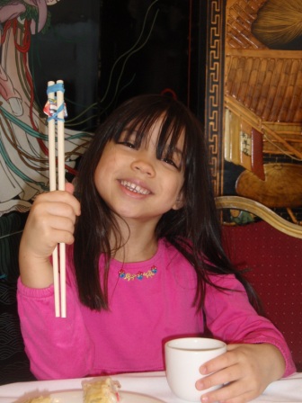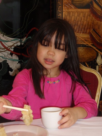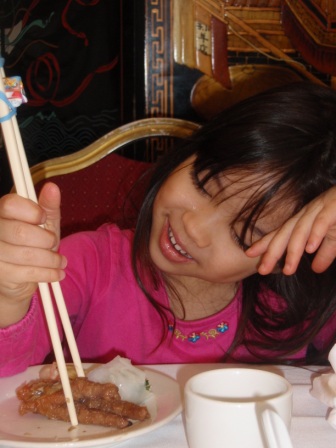 Once inside the restaurant, she enjoys using her chopsticks to eat dumplings and chicken feet.