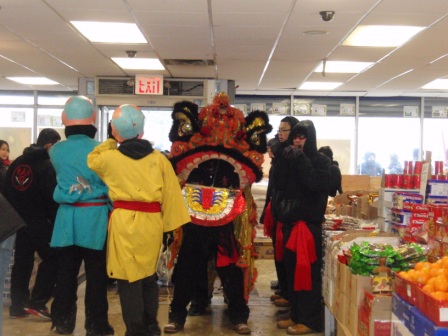 going around to the local businesses to bestow good luck. Aurora is not a fan of the firecrackers being