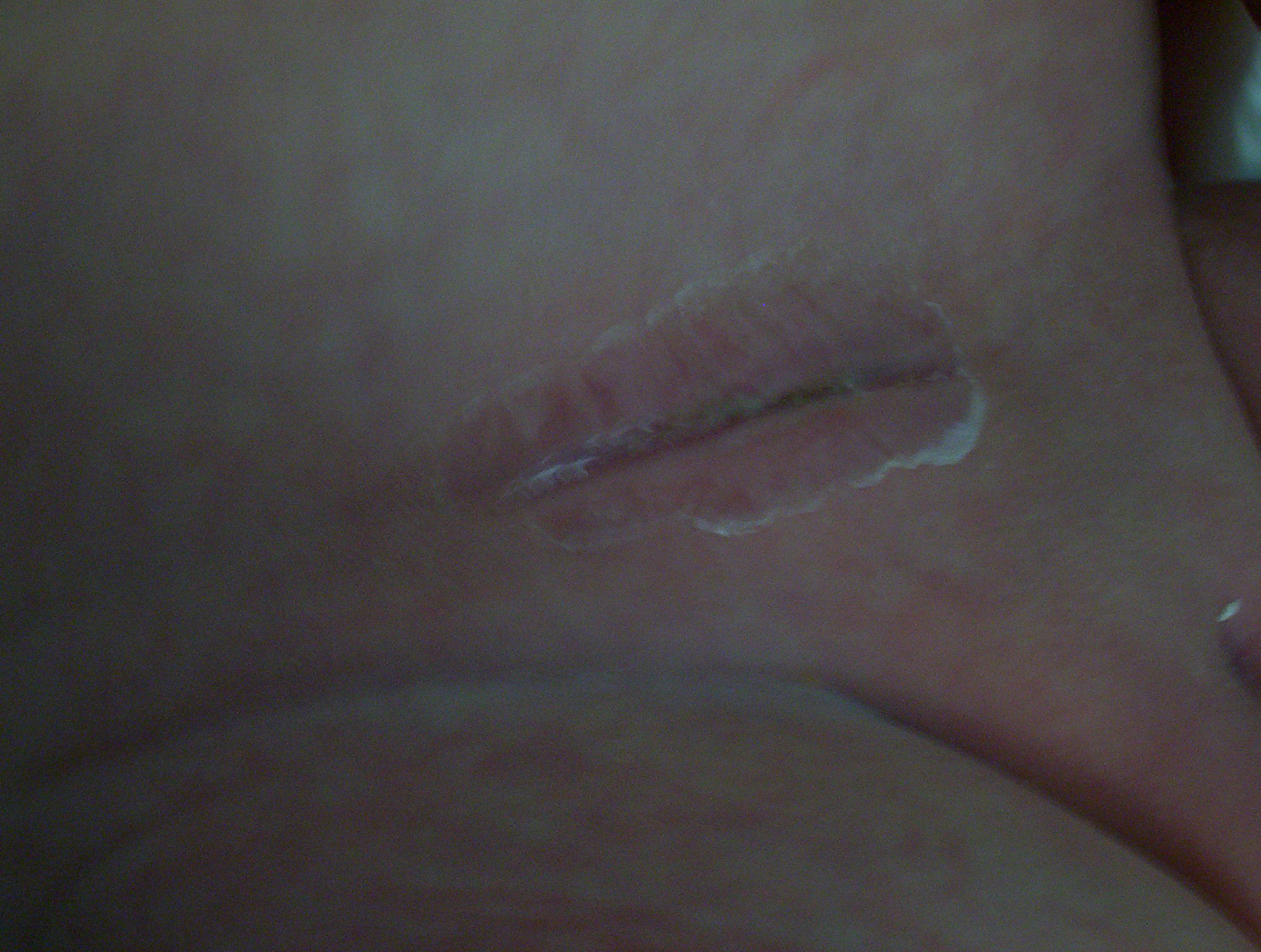 held together with some sort of skin superglue, which fell off a week later. By her two week post-op check-up,