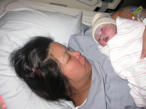 This was taken early on Saturday March 1, 2008. The contractions were very mild still and Kathy is able