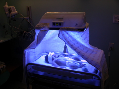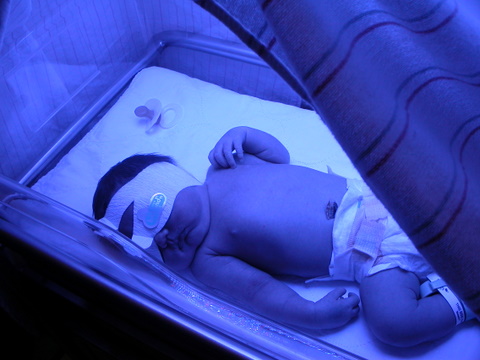 The treatment for jaundice involved having Aurora under blue LED lights for 24 hours. She had to wear a