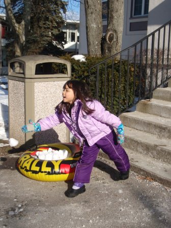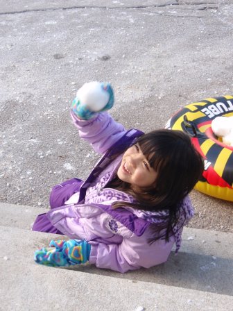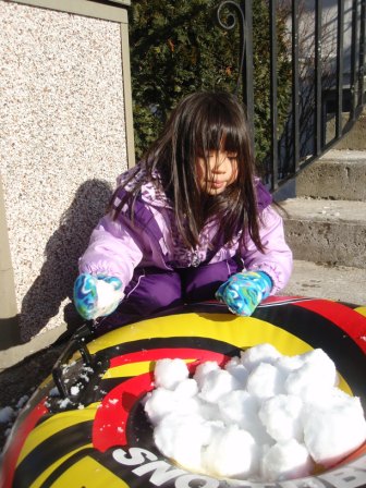 Aurora builds up an arsenal of snowballs, drags it up the hill and off the field...and then waits outside the