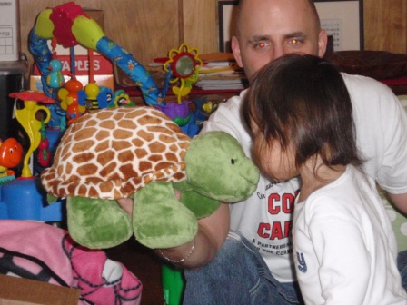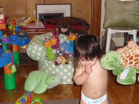 July 7, 2009: Aurora finds the pile of stuffed animals left by Grandma. She promptly runs over and