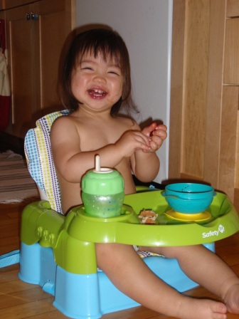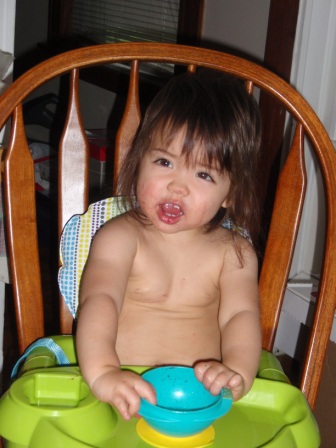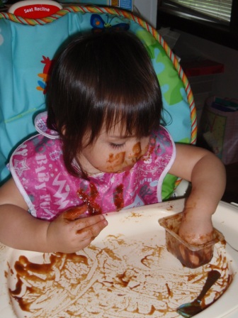 July 16, 2009: I am not sure where the apple-prune puree ends and Aurora begins! She is still trying to master
