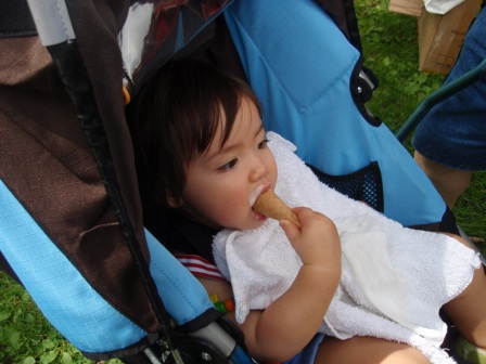 first encounter with a vanilla ice cream cone - good thing she has two parents who shared their cones with her!