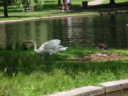kinds of birds (all "ducks" in her mind), including a nesting pair of swans.