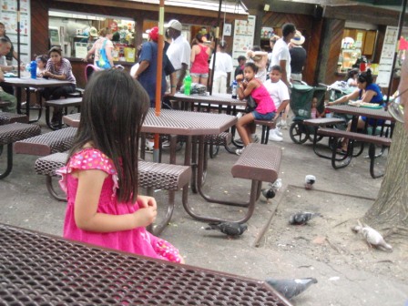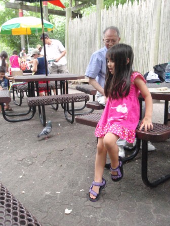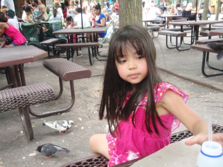 Lunch break! Aurora discovers that NYC pigeons are not shy about approaching people