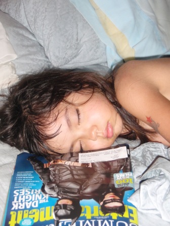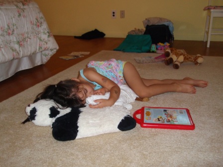 July 16, 2012: Aurora is so tired, she falls asleep on Mama and Baba's bed.
