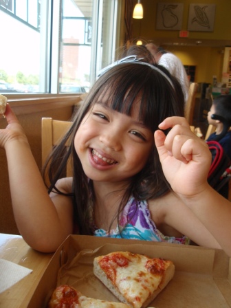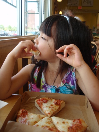 lunch out. Here she is enjoying a pizza at Whole Foods.