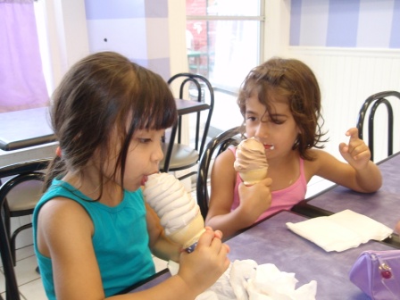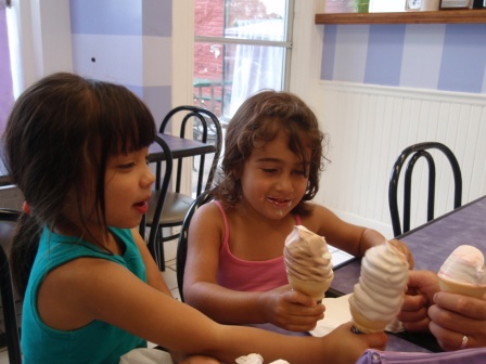 At Truly Yogurt, Aurora and Saavedra get kiddie cones that are as big as their heads!