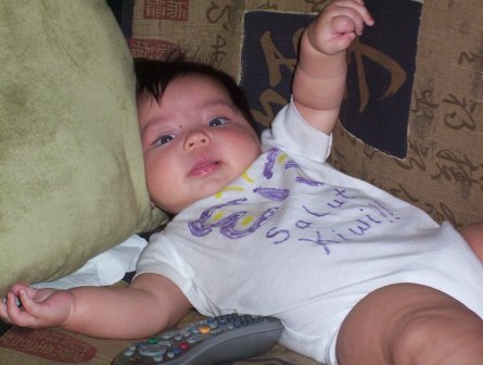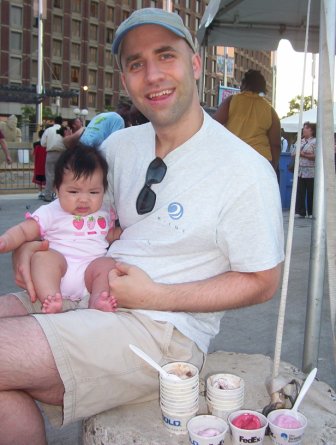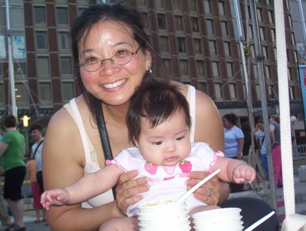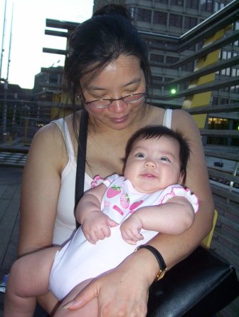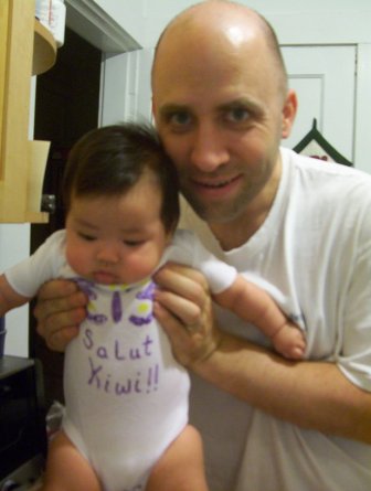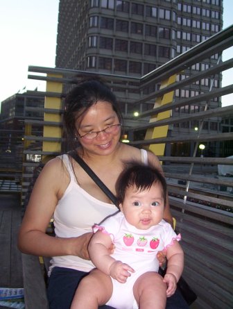 June 1: Wai Pao gets one last hug with Aurora before we leave Yorktown to return to Boston. Aurora's onesie is a hit with