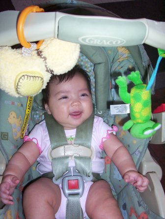 June 19: Enjoying the bouncy chair. She really reaches out to touch the animals now.