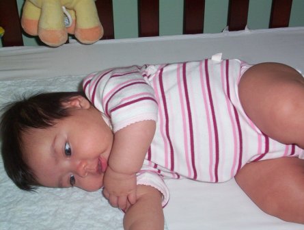 harder to get her right thumb into her mouth when she is in this position. But she finds a way to do it!