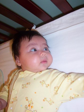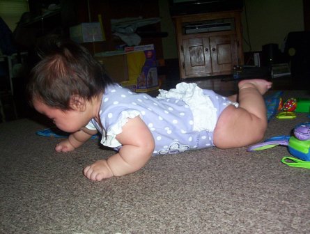 as are her legs. Aurora prefers to practice standing up over tummy time. In her crib, she has begun to move around