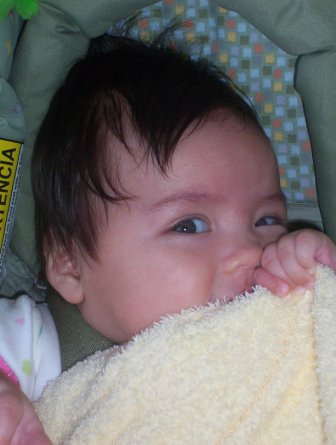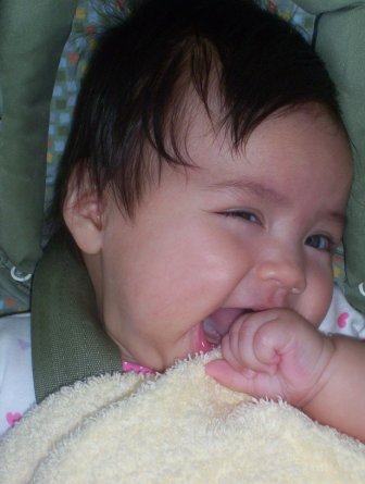small objects like rattles, and she can grasp her burp cloth and our shirts in her fist. Her grip can be quite strong,