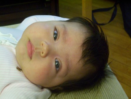 June 30: Aurora now loves to look at the baby in the mirror (at first,