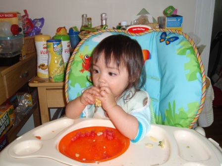 stand up in her chair too. We are sure that she will fall off it at some point. Aurora is very adventurous around