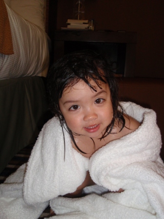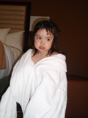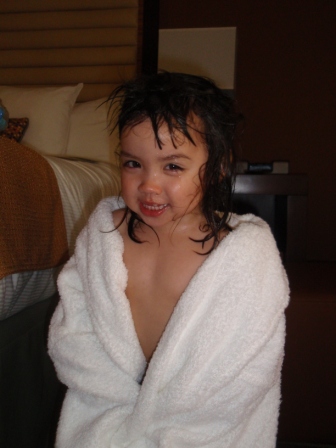 After all that playing, time to take a shower! Aurora loved the fluffy bathrobe that