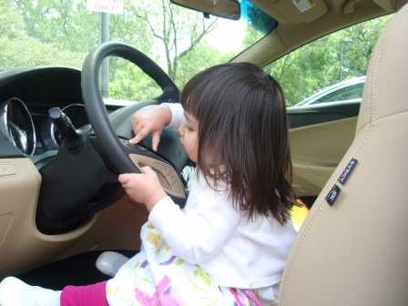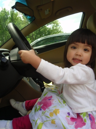 Aurora tried out the rental car. She was a bit startled when she hit the horn.