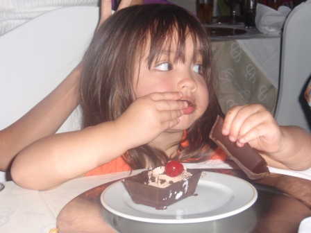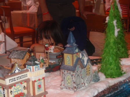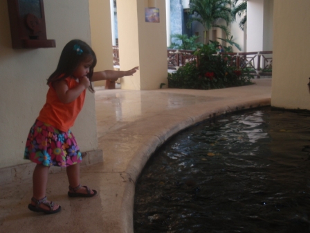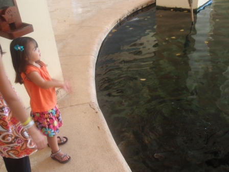 Feeding the fish in the lobby. Aurora is enjoying her third lollipop