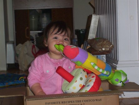 Aurora plays in a box. Notice how she can reach out to get the rattle she dropped.
