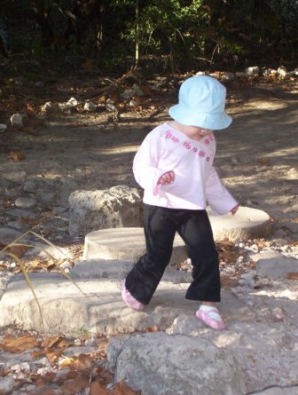 Sarah crosses a dry creek bed.