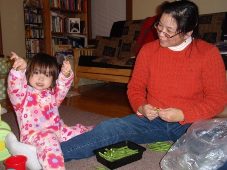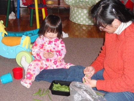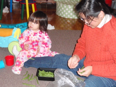 Back at home, Aurora helps Mama prep the green beans for dinner that night.