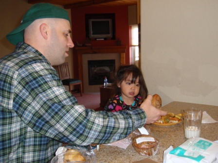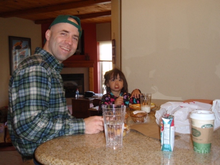 kitchen, fireplace and balcony. Here Jon is introducing Aurora to her first bran muffin - she